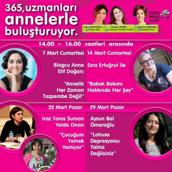 7 Mart Cumartesi Blogcu Anne Elif Doğan ile “Annelik her zaman tozpembe değil”, 14 Mart Cumartesi Esra Ertuğrul ile “Bebek bakımı hakkında hersey” , 22 Mart Pazar Yelda Onan ve Iraz Toros Suman ile “Çocuğum yemek yemiyor” ve 29 Mart Pazar Aysun Bal Ömeroğlu ile “Lohusa depresyonu:yanlız değilsiniz” konulu söyleşileri kaçırmayın…