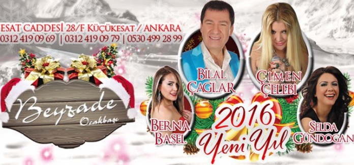 YILBAŞI2016 Beyzade Ocakbaşı Yılbaşı 2016 AnkaraSosyete - 16 Aralık 2015 FacebookTwitterPinterestWhatsApp Beyzade Ocakbaşı 2016 Yılbaşı Programı: 20:15 – 21:30 ESKİ 45’LİKLER VE POP Berna BAŞEL 21:45 – 23:00 THM Selda GÜNDOĞAN 23:00 – 00:30 TSM Çimen ÇELEBİ 00:30 ORYANTAL EDA 00:50 – 02:30 TSM Bilal ÇAĞLAR