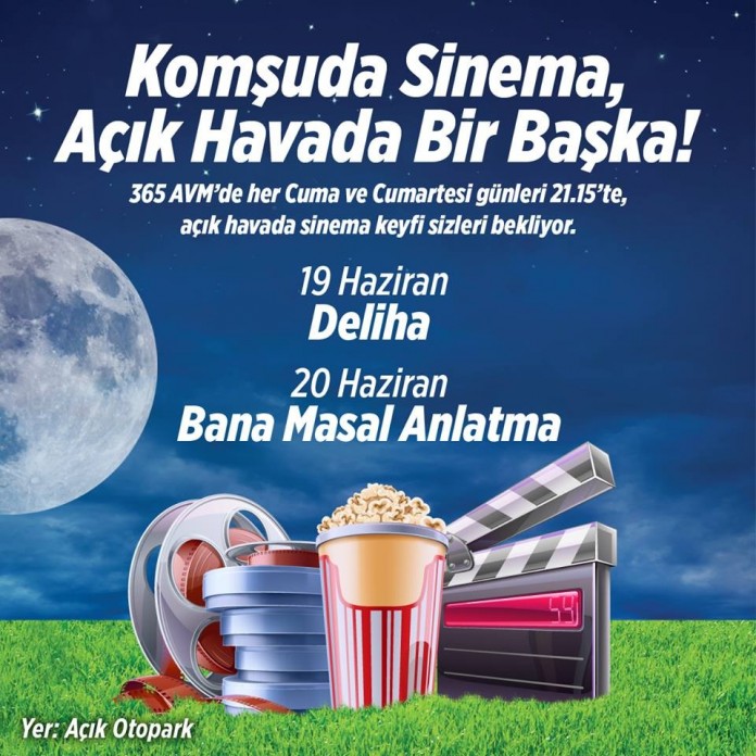 Açık otoparkta yapılacak gösterimde bu hafta 19 Haziran Cuma günü “Deliha”, 20 Haziran Cumartesi günü ise “Bana Masal Anlatma” filmlerini izleyebilirsiniz.