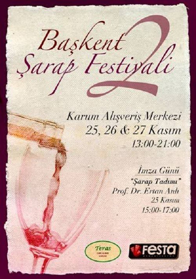 Başkent Şarap Festivali’nin 2.cisi 25-26-27 Kasım 2011 tarihlerinde Karum’da düzenleniyor. Tüm Ankaralıların davetli olduğu ücretsiz etkinlikte en güzel şarap ve peynirleri tadabilirsiniz. Festivale katılacak firmalar ise şunlar;Kavaklıdere, Doluca, Pamukkale, Vinkara, Sevilen, Büyülübağ, Umurbey, Paşaeli selendi, 4tp, Yazgan, Umurbey, Tomurcukbağ, Arcadia, Şatonuzun, Barbera, Gülor,Turasan,Diren ve Peynirci.