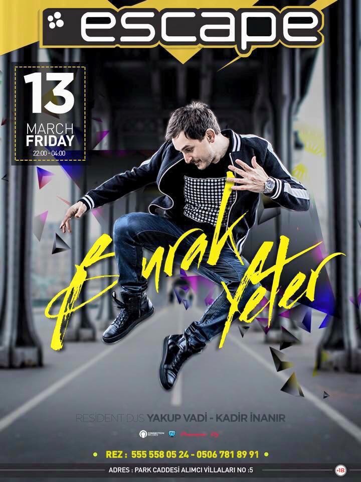 13 Mart Cuma gecesi Burak Yeter Escape’de sahne alacak. 22:00’de başlayacak gecede DJ Yakup Vadi ve DJ Kadir İnanır’da performaslarıyla geceye renk katacaklar.