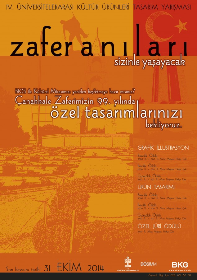 Kültürel mirasın korunması ve yaşatılması amacıyla çeşitli kültür projelerine imza atan BKG (Bilkent Kültür Girişimi), bu yıl dördüncüsü düzenlenecek Üniversitelerarası Kültür Ürünleri Tasarım Yarışması’nın ana temasını Çanakkale Zaferi olarak belirledi. 2015 yılında 100. yıldönümü kutlanacak olan Çanakkale Zaferi’ni iki yıl boyunca yarışmanın ana konsepti haline getiren BKG, zaferin 99’uncu yıl dönümü temasını ‘Çanakkale Zaferi Anıları ve Mektuplardan Esinlenme’, 100’üncü yıl dönümü temasını ise ‘Zaferin 100’üncü Yılı’ olarak belirledi.