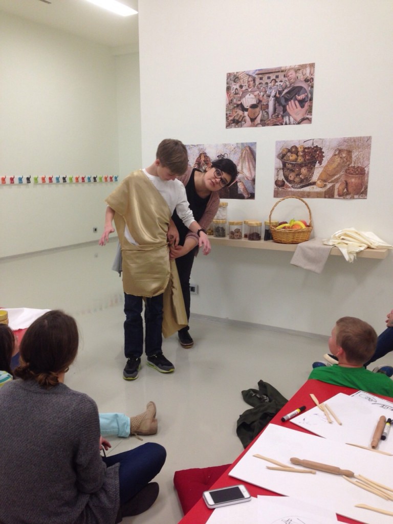 Perşembe günleri 10.00-12.00 saatleri arasında gerçekleşecek “Kostümlerle Antik Roma’ya Yolculuk” atölyesi, çocukları bir Roma Şöleni’ne davet ediyor. Atölye kapsamında Antik Roma’daki şölenlerin nasıl gerçekleştirildiğini öğrenecek çocuklar, daha sonra bu hayali şölene gitmek üzere ipekli ve pamuklu kumaşlardan tunikler ve togalarını giyip, zeytin yapraklarından yapılmış taçlarını hazırlayıp takacak.