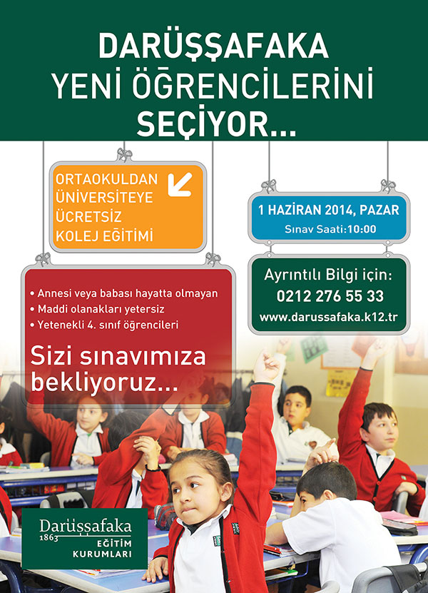 Türkiye’de 151 yıldır eğitimde fırsat eşitliğinin sembolü olan Darüşşafaka Eğitim Kurumları eğitimle yaşamları değiştirmeyi sürdürüyor. 1-10 Nisan arası 26 ilde yapılacak sınav tanıtım toplantılarının ardından, Darüşşafaka Giriş Sınavı 1 Haziran’da 20 ilde gerçekleştirilecek. Darüşşafaka Giriş Sınavı için son başvuru tarihi ise 28 Mayıs 2014.