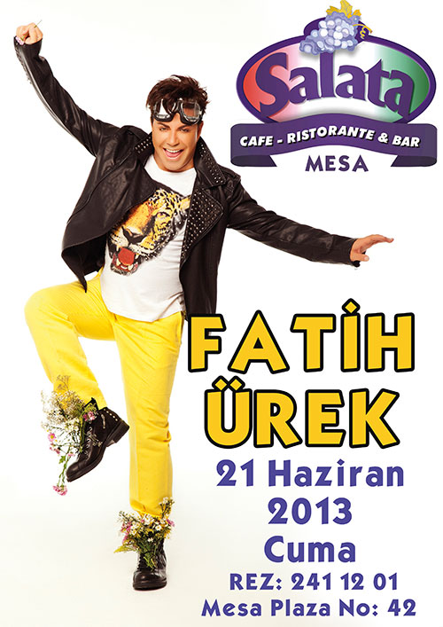 GECE HAYATI Fatih Ürek Salata Mesa’da AnkaraSosyete - 14 Mayıs 2013 FacebookTwitterPinterestWhatsApp Salata sevilen şarkıcı Fatih Ürek’i konuk ediyor. Sahne performansıyla Ankaralıların büyük beğenisini kazanan Fatih Ürek 21 Haziran 2013 Cuma gecesi Salata Mesa’da sahne alacak Rez: 241 12 01
