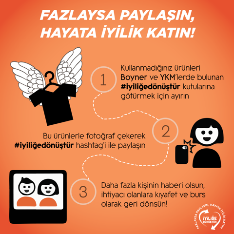 Boyner Mağazaları düzenlediği kampanya ile kullanmadığınız kıyafetleri ihtiyaç sahipleriyle buluşturuyor. Kampanyaya katılmak için yapmanız gereken tek şey ise kullanmadığınız kıyafetleri Boyner Mağazaları’nda bulunan #iyiliğedönüştür kutularına bırakmanız yeterli.