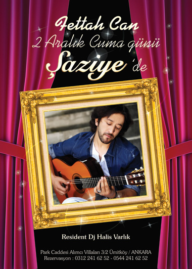 Geçtiğimiz hafta Fatih Ürek ile yaptığı açılış ile Ankara gecelerine hızlı bir giriş yapan Şaziye 2 Aralık 2011 Cuma günü sevilen sanatçı Fettah Can’ı konuk ediyor. Şaziye ayrıca Her Cuma Cumartesi Canlı Müzik’te Coşkun’u Ankaralılarla buluştururken, Dj kabininde ise Halis Varlık, Coşkun’a eşlik ediyor. Rez: 241 62 52. Park Caddesi No:3/2 Çayyolu.