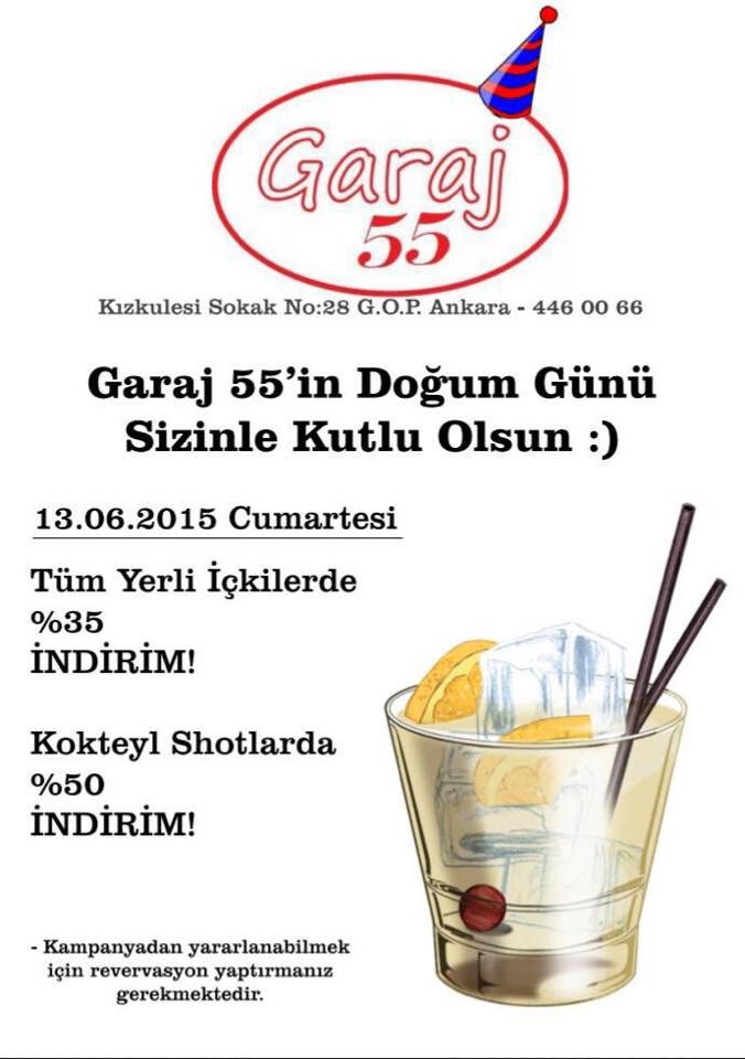 Garaj 55 doğum gününü müşterileriyle beraber kutluyor. 13 Haziran Cumartesi akşamı tüm yerli içkilerde %35 kokteyl shotlarda %50 indirim rezervasyon yaptıran tüm müşterilerini bekliyor.
