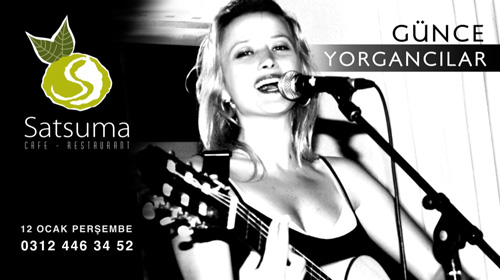 GECE HAYATI Günce Yorgancılar Perşembe Satsuma’da AnkaraSosyete - 10 Ocak 2012 FacebookTwitterPinterestWhatsApp Günec Yorgancılar 12 Ocak 2012 Perşembe akşamı Satsuma’da sahne alıyor. Rez: 446 33 11