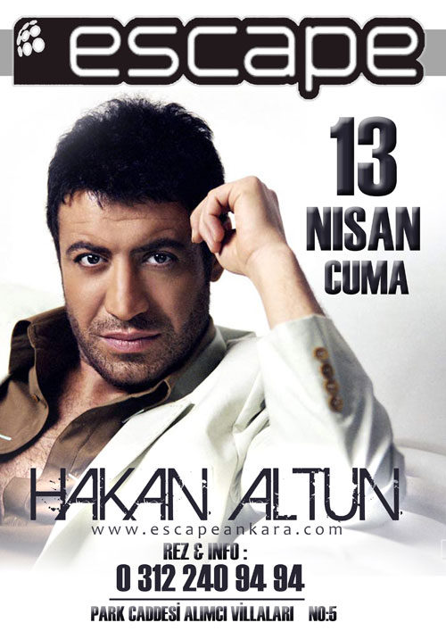 GECE HAYATI Hakan Altun 13 Nisan 2012 akşamı Escape’de AnkaraSosyete - 11 Nisan 2012 FacebookTwitterPinterestWhatsApp Sevilen sanatçı Hakan Altun yoğun istek üzerine tekrar Escape sahnesinde. 13 Nisan 2012 Cuma gecesi düzenlenecek gece için Rez: 240 94 94