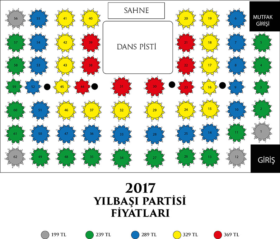 Damsız girişin olmayacağı bu muhteşem yılbaşı gecesinde 10 ARALIK 2016 TARİHİNE Kadar Yapılan Ödemelerde 199 TL’ lik Masalar Hariç Diğer Masalarda Kişi Başı 25-TL Erken Rezervasyon İndirimi Uygulanacaktır.