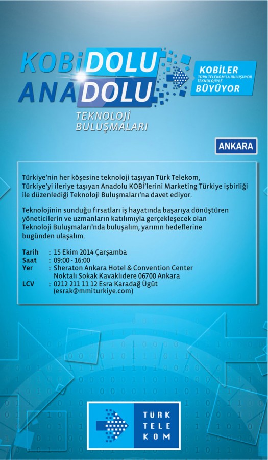 Türk Telekom, müşterilerine bir “Teknoloji ortağı” olarak hizmet vermeyi ve sunduğu yenilikçi ve hızlı servislerle onlara rekabet avantajı sağlamayı amaçlıyor. Bu amaç doğrultusunda düzenlenen KOBİ Dolu Anadolu Zirvesi’nde konusunda uzman isimler Anadolu’daki Küçük ve Orta büyüklükteki işletmelere dijital dünyada iş yapmanın avantajlarını ve markalaşmanın yollarını anlatacak.