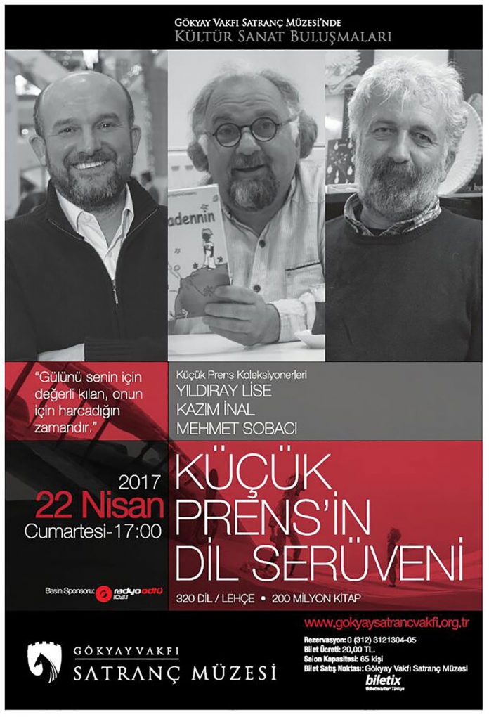 22 Nisan Cumartesi günü saat 17.00’de Gökyay Vakfı Satranç Müzesi’nde Yıldıray Lise ve Kazım İnal ile birlikte Küçük Prens konuşulacak. İlk baskısı 1943 yılında yapılan kitabın 7’den 70’e herkese nasıl hitap edebildiğini, her okunduğunda nasıl insana farklı bir haz verdiğini Ankaralı Küçük Prens tutkunları ve kitapseverlerle paylaşılacak.