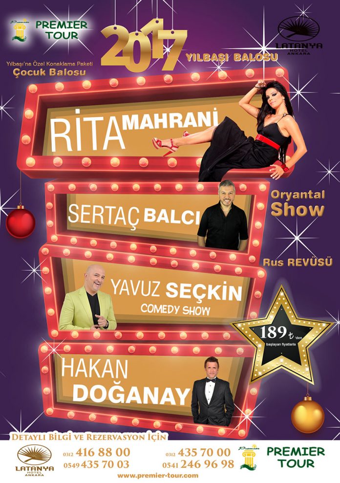 Birbirinden kaliteli yılbaşı organizasyonlarına imza atan Premier Tour farkıyla 5* Latanya Hotel Ankara’da (Eski Dedeman Otel) yine kendinden çokça söz ettirecek bir yılbaşı organizasyonu ile Rita Mahrani ile eğlenceye doyacaksınız…