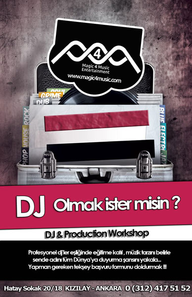 Dj Workshop eğitimi almak isteyenler www.magic4music.com adresinden online başvuru formu doldurabilir. 0 (312) 417 51 52 numaralı telefondan detaylı bilgi alabilirler. Magic 4 Music Hatay Sokak 20/18 KIZILAY – ANKARA