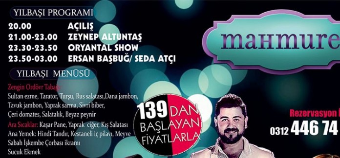 YILBAŞI2016 Mahmure Yılbaşı 2016 AnkaraSosyete - 12 Aralık 2015 FacebookTwitterPinterestWhatsApp Mahmure Yılbaşı 2016 programında Ersan Başbuğ, Seda Atçı, Zeynep Altuntaş ve Oryantal Aylin var. Rez: 0 312 446 74 71