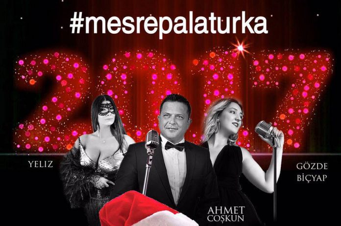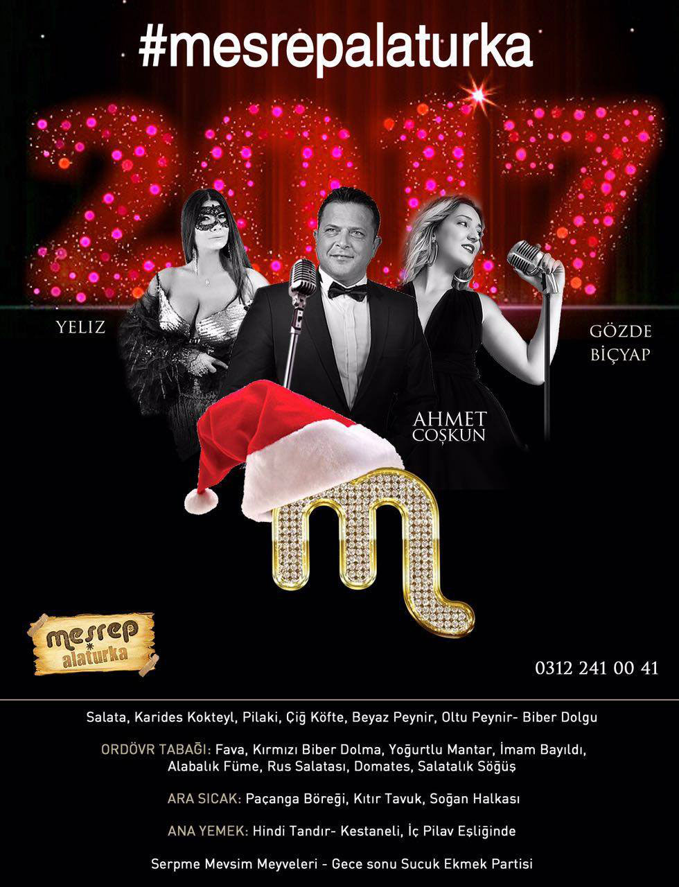 YILBAŞI2017 Meşrep Alaturka 2017 Yılbaşı Programı AnkaraSosyete - 13 Aralık 2016 FacebookTwitterPinterestWhatsApp Meşrep Alaturka 2017 Yılbaşı Programı Ahmet Coşkun, Yeliz ve Gözde Biçyap’tan oluşuyor. Yılbaşı menüsü; mezeler, ordövr tabağı, ara sıcaklar, ana yemek, meyve-sucuk ekmek partisinden oluşacak. Rezervasyon: 0 312 241 00 41