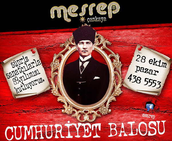 GÜNDEM Meşrep’de CUMHURİYET Balosu AnkaraSosyete - 25 Ekim 2012 FacebookTwitterPinterestWhatsApp Meşrep Çankaya 28 Ekim 2012 Pazar akşamı Cumhuriyet Balosu’na ev sahipliği yapıyor. Sürpriz sanatçıların sahne alacağı gecede Cumhuriyetimizin 89. kuruluş yıldönümü çok özel bir balo ile kutlanacak. Rez: 438 55 53