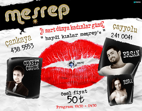 GECE HAYATI Meşrep’de Kadınlar gününe özel AnkaraSosyete - 6 Mart 2012 FacebookTwitterPinterestWhatsApp Meşrep Çankaya ve Çayyolu’nda 8 Mart Kadınlar gününe özel programıyla Dünya Kadınlar Günü kutlanıyor.