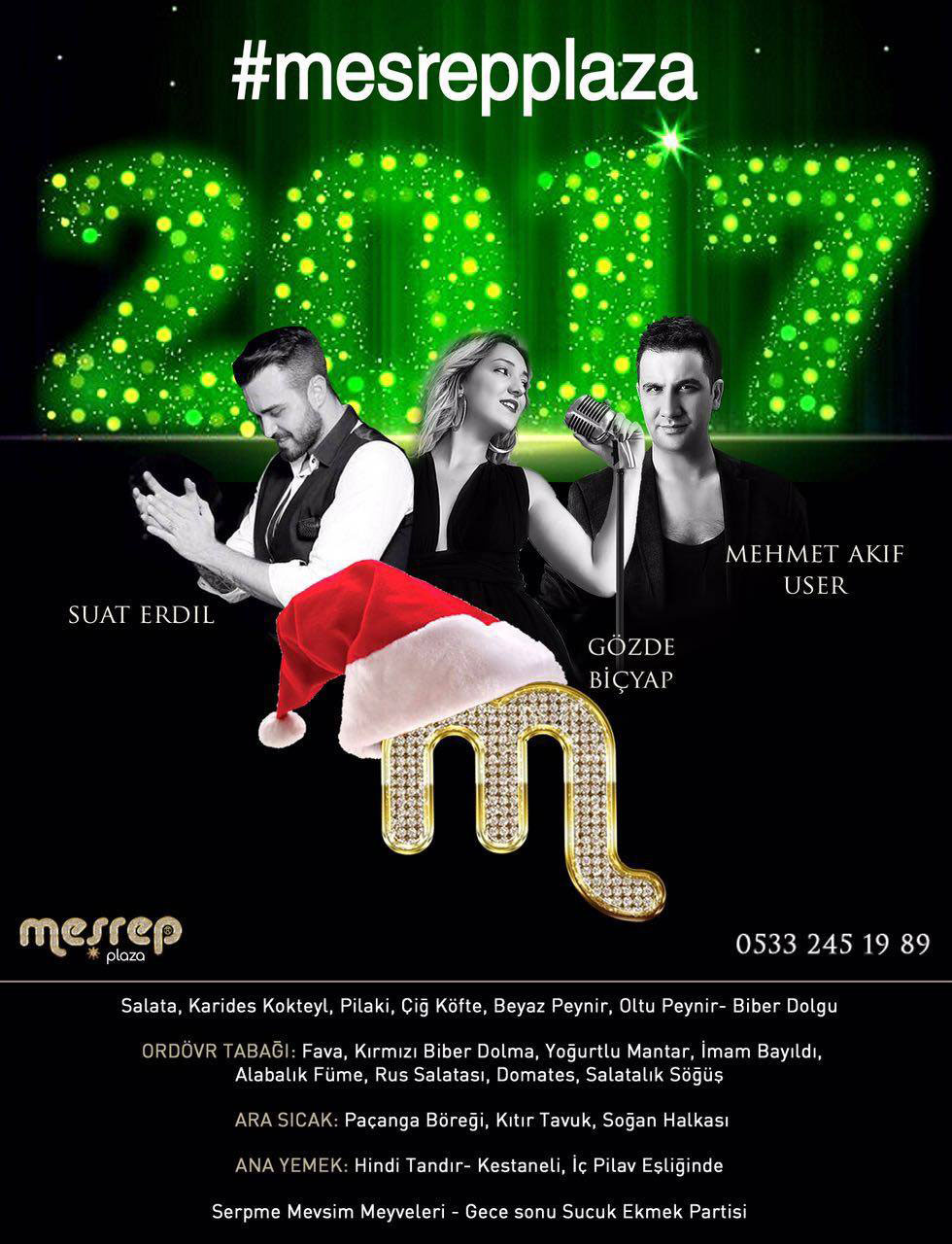 Meşrep Plaza 2017 Yılbaşı Programı Mehmet Akif User, Gözde Biçyap ve Suat Erdil’den oluşuyor.
