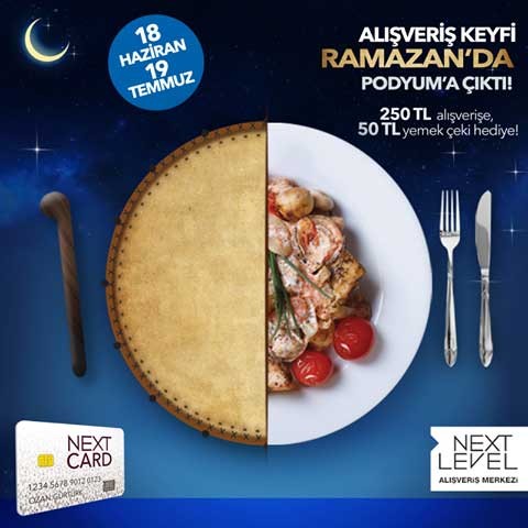 ANKARA Ramazan’da Next Level’da Alışverişin Keyfini Çıkarın Kıymet Ruşitler - 7 Temmuz 2015 FacebookTwitterPinterestWhatsApp Next Level AVM 18 Haziran – 19 Temmuz tarihleri arsında yapacağınız her 250 TL alışverişe 50 TL yemek çeki hediye ediyor.