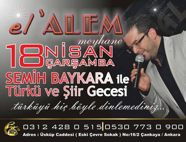 Elalem Meyhane 18 Nisan 2012 Çarşamba akşamı Semih Baykara’yı konuk ediyor. Türkü ve Şiirin yoğunlukta olduğu gece saat 20:00’da başlayacak. Rez: 428 0 515