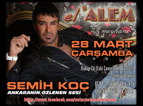 GECE HAYATI Semih Koç Elalem’de AnkaraSosyete - 16 Mart 2012 FacebookTwitterPinterestWhatsApp Sevilen sanatçı Semih Koç 28 Mart 2012 Çarşamba akşamı Elalem’de sahne alıyor. Rez: 428 05 15