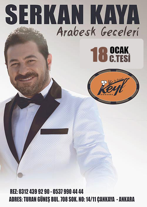 GECE HAYATI Serkan Kaya 18 Ocak’da Keyf’te AnkaraSosyete - 8 Ocak 2014 FacebookTwitterPinterestWhatsApp Serkan Kaya Keyf’te sahne alıyor Sevilen sanatçı 18 Ocak 2014 Cumartesi gecesi bir kez daha sevenleriyle Keyf’te buluşacak. Rez: 03124399290