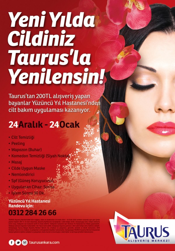 Taurus AVM, Taura Card sahiplerine yeni yılda da kazandıracak. Taurus’tan bir gün içinde toplam 200 TL ve üzeri alışveriş yapan Taura Card sahibi herkese, Yüzüncü Yıl Hastanesi’nden cilt bakım uygulaması hediye ediliyor. Yalnızca kadınların kullanabileceği uygulama ile Taurus AVM, kışın ciltteki yıpratıcı etkilerine çare olacak.