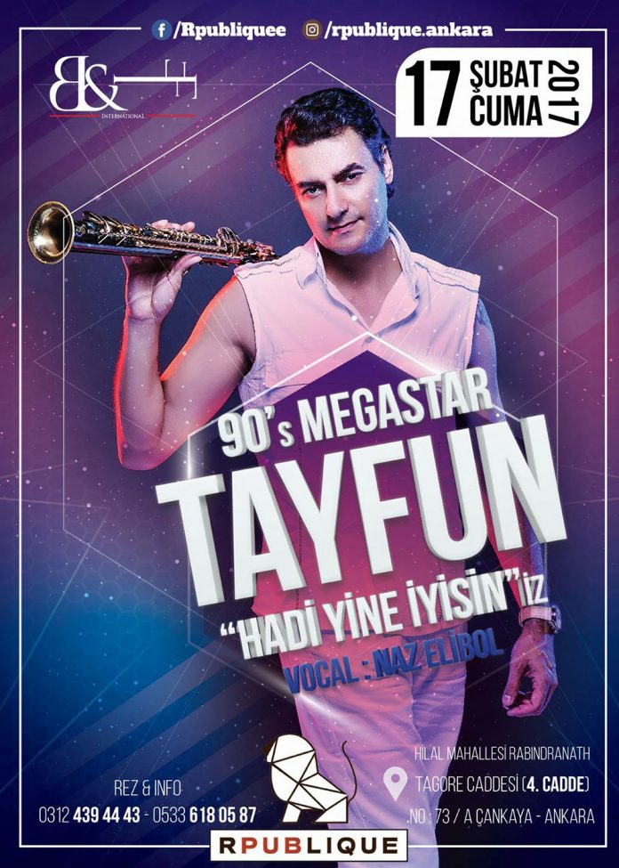 ANKARAGECE HAYATIKÜLTÜR & SANATKONSER & FESTİVAL Tayfun Rpublique’de AnkaraSosyete - 7 Şubat 2017 FacebookTwitterPinterestWhatsApp 90’ların unutulmaz yıldızlarından Tayfun 17 Şubat 2017 Cuma akşamı Rpublique’de sahne alacak. Gece’de Naz Elibol vocal’de Tayfun’a eşlik edecek. Rezervasyon: 0 312 439 44 43