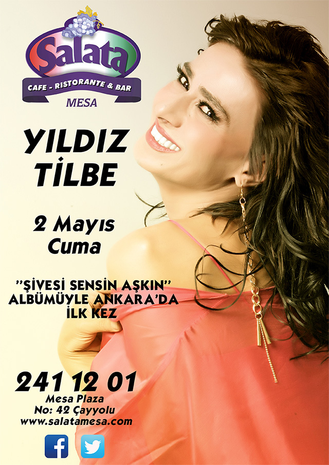 Tarkan, Deniz Seki, Fatih Erkoç, Ebru Gündeş gibi önemli yorumculara vermiş olduğu şarkıları kendi yorumuyla “Şivesi Sensin Aşkın” albümünde bir araya getiren Yıldız Tilbe 2 Mayıs 2014 Cuma gecesi Ankaralı sevenleriyle Salata Mesa’da buluşuyor. Rez: 03122411201